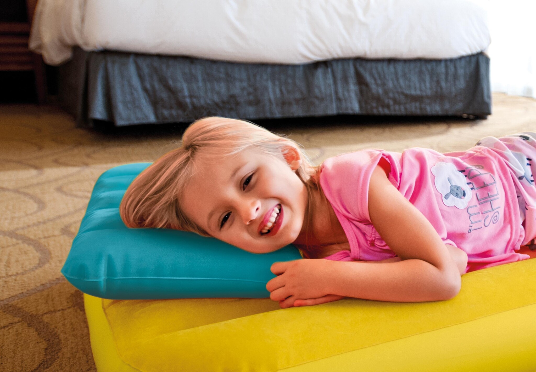 De opblaasbare Kidz kussen is erg handig om mee te nemen voor lange reizen met de auto, vliegtuig of de trein. Neem hem ook mee op vakantie. Want slapen op een luchtmatras met een Kidz Kussen is natuurlijk wel zo comfortabel voor uw kinderen. Dit reiskussen voor kinderen ondersteunt het hoofd en een extra zachte toplaag van 'flock materiaal' zorgt voor net wat extra comfort.